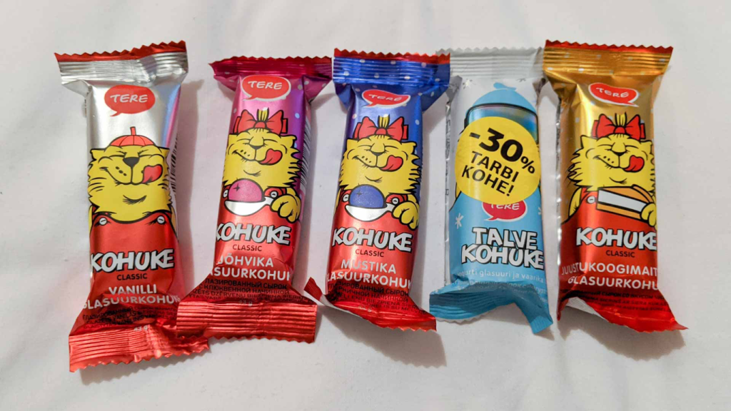 La première gâterie qu’on à goûtée s’appelle un Kohuke. C’est une petite barre de fromage caillé recouverte de chocolat. Tu trouves ca dans la section réfrigérée de l’épicerie, et ça vient dans plein de saveurs différentes.