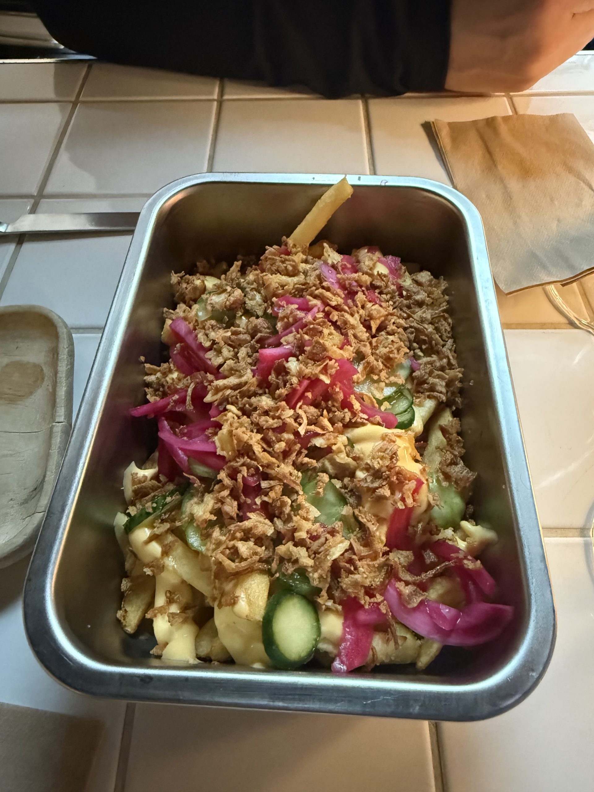 The last thing we tried was similar to a poutine. Basically, it’s fries topped with a delicious cheese gravy, sprinkled with dried fried onion, pickled onions and pickled cucumbers. We like to call it an “Estonian poutine” 🙂 It was really good!